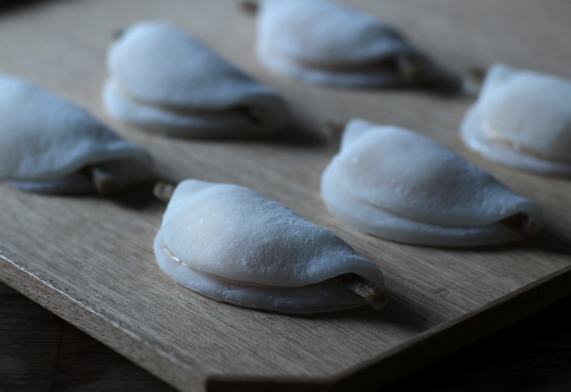 Hanabira mochi | 柔らかな白にほのかに透ける紅色が美しい花びら餅。求肥は白玉粉を使い、電子レンジで家庭でも手軽に作ることができます。 薄く伸ばした紅白の求肥で、白味噌餡と牛蒡の蜜煮を包み込んだ迎春菓。新年の願いや想いを包み込み、事始めとしてつくりたい和菓子です。